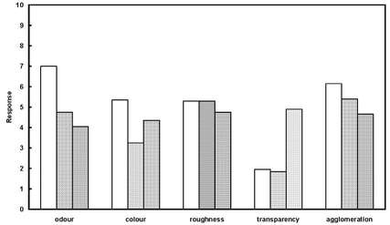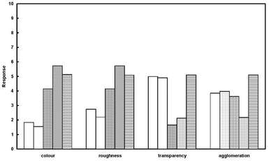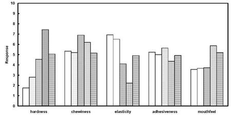 Hardness (soft/hard) Chewiness (not chewy/chewy) Elasticity (not rubbery/rubbery) Adhesiveness (not sticky/sticky) Mouthfeel (dry/wet)