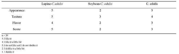Consumers did not like the transparency of C. edulis noodles. The reason could be that the Ecuadorian people are used to eat wheat flour noodles, which are opal. Lupine-C. edulis noodles are opal as wheat flour noodles and were more accepted than C. edulis noodles. Soybean-C.edulis noodles were the less accepted by the consumers (Table 6). The intention of buying showed that from 39 possible consumers, 43.6% were willing to buy lupine-C. edulis, 43.6% C. edulis and 12.8% soybean-C.edulis.