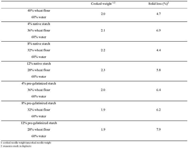 Noodles were processed by partial replace of wheat flour with native or pre-gelatinized starch (Table 2). The amounts of wheat flour that were replaced were 4, 8 and 12%. The increase of native starch content in wheat flour noodle composition increased cooked weight, whereas an increment of pre-gelatinized C. edulis starch showed a reduction of the cooked weight with no significant difference. The solid loss results did not follow a special trend, however noodles made with mixtures of wheat flour and either native or pre-gelatinized starch had higher solid loss than wheat flour noodles. This shows that there is no improvement on the cooking stability (cooked weight and solid loss) of wheat flour noodles by adding either native or pre-gelatinized C. edulis starch.