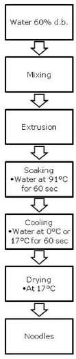 Samples for the sensory evaluation were prepared by weighing 150 g of noodles, which were soaked in water at room temperature for 5 min. Afterwards the noodles were cooked in 3 l of water at boiling temperature for 9 min. The noodles were cooled down by soaking in water at room temperature, before being served to the panelists. The sensory evaluation was performed using a lineal scale from 0 to 10. The results were processed with a STATGRAPHICS at a significance level of 5 %.