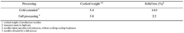Table 3. Cooked weight and solid loss of noodles obtained after complete processing and only after cold extrusion. Mixture of native and 12 % C. edulis pre-gelatinized starch