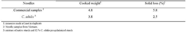 Noodles made of a mixture of native starch and 12 % C. edulis pre-gelatinized starch were compared with commercial C. edulis starch noodles originating from Vietnam. Commercial samples showed higher cooked weight and solid loss than the produced noodles, Table 4.