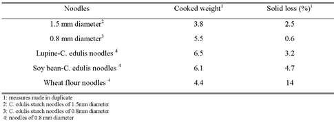The protein content of lupine-C. edulis and soybean-C. edulis noodles were 16.5 and 11%, respectively. Mixtures of lupine-C. edulis and soybean-C. edulis noodles had higher cooked weight and solid loss than noodles prepared by using only C. edulis starch (Table 5). However the solid losses of the mixtures were lower than those of noodles prepared with wheat flour only.