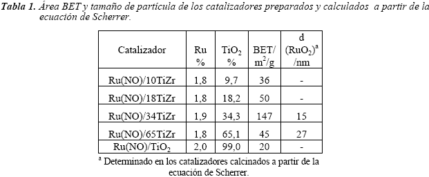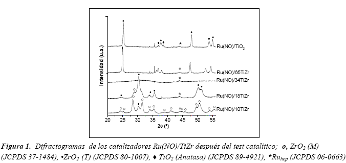 Los soportes TiO2-ZrO2 con distinto contenido en TiO2 se ha preparado mediante el método sol-gel, por mezcla de disoluciones propanólicas de los correspondientes propóxidos de titanio y zirconio en atmósfera de Ar sobre una disolución acuosa de propanol, utilizando un método similar al reportado previamente para la preparación de otros óxidos [5-6]. Los soportes fueron secados y posteriormente calcinados a 873 K durante 5 h, y se denominaron aTiZr, siendo "a" el % en peso nominal de TiO2 en el material. Los catalizadores de Ru se prepararon mediante impregnación a humedad incipiente a partir de disoluciones de Ru(NO)(NO3)3. Los catalizadores se denominaron Ru(NO)/soporte según el precursor de rutenio utilizado.