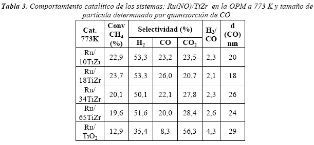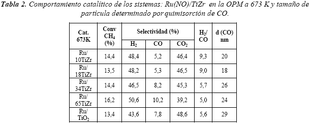 El comportamiento catalítico en la CPOM (oxidación parcial catalítica de metano) de los catalizadores basados en Ru/xTiO2-ZrO2 se muestra en la tabla 2.