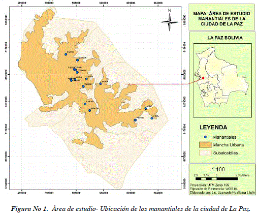 El área de estudio está ubicada en la ciudad Nuestra Señora de La Paz, Sede de Gobierno del estado Plurinacional de Bolivia. Dentro de la mancha urbana, se recolectaron 16 muestras de agua proveniente de manantiales, la selección de los puntos de muestreo se hizo en base a estudios de investigación preliminares que identificaron a los manantiales como fuentes alternativas de suministro de agua.