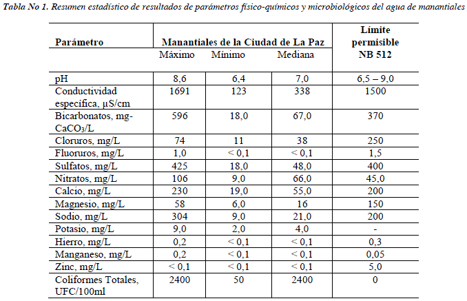 La Tabla 1 muestra un resumen de la estadística de resultados de los análisis físico-químicos de las muestras colectadas en 16 manantiales de la ciudad de La Paz.