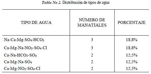 Observando este diagrama y evaluando los resultados de la Tabla 2, se puede evidenciar que no hay una gran diferencia entre la composición química de las diferentes muestras de agua de manantiales. Los tipos de agua más importantes presentan la siguiente distribución: Na-Ca-Mg-SO4-HCO3 y Ca-Mg-Na-NO3-SO4-Cl (18,8%); Ca-Na-HCO3-SO4, Ca-Mg-Na-SO4, Ca-Mg-NO3-SO4-Cl (12,5%). El restante 6,3% está constituido por tipos de agua mixtos.