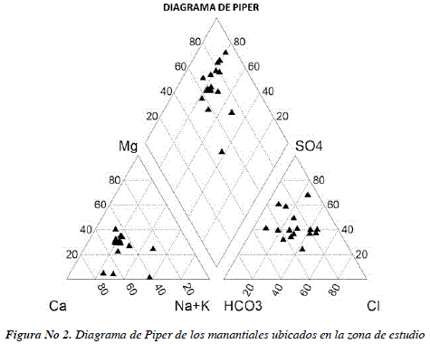 Los resultados de laboratorio referentes a los iones mayoritarios fueron representados en un diagrama de Piper (Figura No 2).