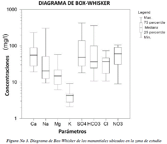 Para evaluar los resultados y realizar una mejor descripción de la hidroquímica de los manantiales estudiados, se utilizó el software Aquachem ver. 4.0264 [9]; este software permite elaborar los diagramas Piper, determinar los tipos de agua, elaborar diagramas de Box & Whisker y encontrar correlaciones entre los diferentes iones presentes en las muestras acuosas.