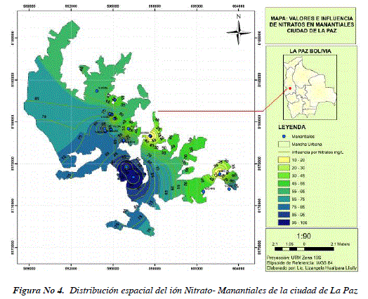 En la figura No. 4 se puede observar la influencia de la presencia de nitratos, donde los valores de 6 manantiales están dentro del rango permitido, para agua de consumo. Las otras 10 muestras se encuentran contaminadas con altas concentraciones de nitrato. Las muestras con códigos V-PEHH de la zona Puerto Esperanza Huano Huanuni, V-I2RA de Aruntaya Irpavi 2, V-BSAR1 de Retamani San Antonio Bajo, V-BSARC Regimiento Castrillo San Antonio Bajo, V-AKC8 Alto Kupini, V-LOA Oscar Alfaro San Antonio, V-ESUR Escobar Uria, V-SSSI Sector IBBO San Antonio, V-VFPA Plaza Arandia Villa Fátima, V-OVL Lacacollo Ovejuyo y V-BVC20 de Bella Vista, sobrepasan el máximo permitido por la NB 512.