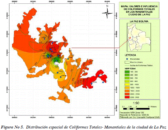 Observando el mapa de distribución espacial para coliformes totales, determinamos que todas las muestras de agua de manantiales se encuentran contaminadas con concentraciones que sobrepasan el máximo permitido por la NB 512 (Figura No 5).