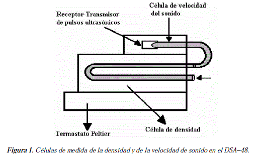 En lo que respecta a la densidad, la célula de medida está formada por un tubo de vidrio (Duran 20) con forma de U, recubierto por una camisa también de vidrio, todo el conjunto está rodeado por un recinto termostático de cobre que controla la temperatura de la célula por efecto Peltier. La célula de medida de la velocidad del sonido se encuentra situada encima de la célula de medida de la densidad, ubicada en una cavidad hecha de teflón que está rodeada lateralmente por el transmisor-receptor de pulsos ultrasónicos, cuya superficie es de acero inoxidable.