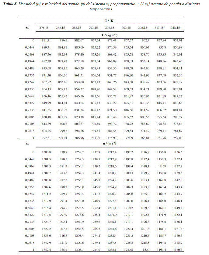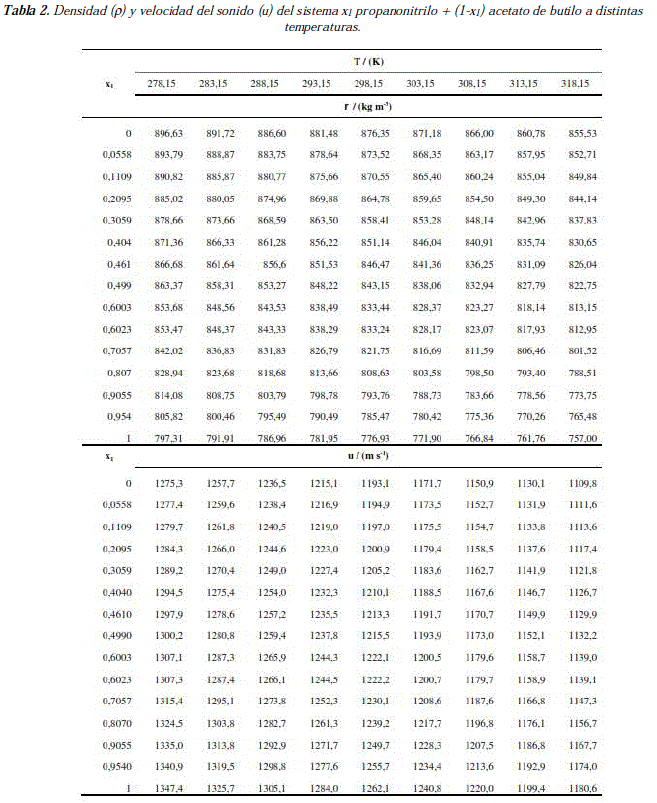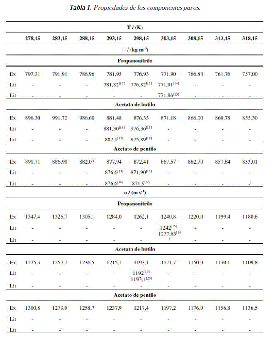 Los productos químicos utilizados en este trabajo de investigación fueron propanonitrilo (> 99,0 %), acetato de butilo (> 99,5 %) y acetato de pentilo (> 99,5 %), todos suministrados por Aldrich, todos los compuestos fueron tratados previamente a su utilización. Fueron deshumidificados con tamices moleculares Fluka 4 Å, producto desecante para reducir al mínimo la presencia de humedad, y se desgasificaron mediante un equipo de ultrasonido. En la Tabla 1 se comparan los valores experimentales de densidad y velocidad del sonido a las distintas temperaturas con los datos disponibles en la literatura; en general, el grado de concordancia obtenido es bueno.