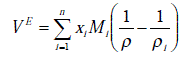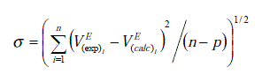 Donde x¡ es la fracción molar del componente i en la mezcla, Mi es el peso molecular del componente, ρ es la densidad de la mezcla, ρi la densidad del componente i, y n es el número de componentes de la mezcla. El error estimado para VE es ±2 10-9 m3 mol-1.