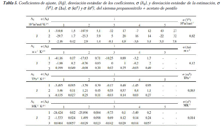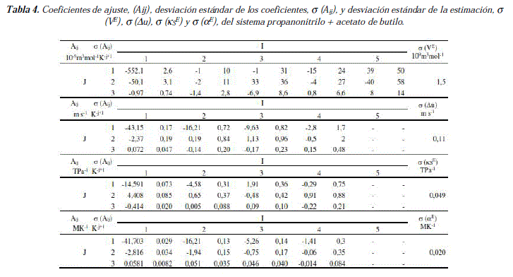 Donde YmE representa VE, αE, Δu, o kSE x es la fracción molar del componente 1, Aij son los coeficientes de ajuste obtenidos por mínimos cuadrados.