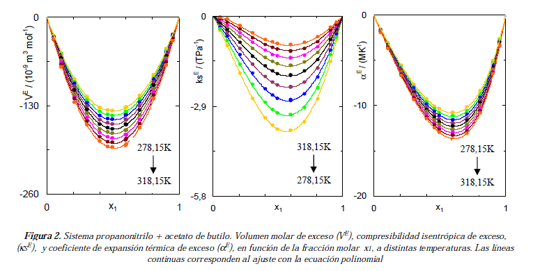 La mezcla binaria propanonitrilo + acetato de butilo, muestra, para la compresibilidad isoentrópica de exceso (KSE ), curvas negativas para todo el rango de concentración y para todas las temperaturas analizadas como se puede observar en la Figura 2, en todos los casos éstos son menos negativos al aumentar la temperatura, y se observa, que presentan una variación con la temperatura muy significativa.