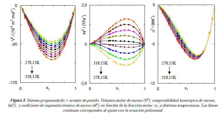 La mezcla binaria propanonitrilo + acetato de butilo, muestra, para la compresibilidad isoentrópica de exceso, kSE, curvas negativas, para todo el rango de concentraciones y temperaturas. El sistema binario propanonitrilo + acetato de pentilo presenta valores negativos de la compresibilidad isoentrópica de exceso, kSE, para todo el rango de concentración y para las primeras dos temperaturas, sigmoidal para las dos siguientes y positivas las restantes como se puede observar en la figura 3.