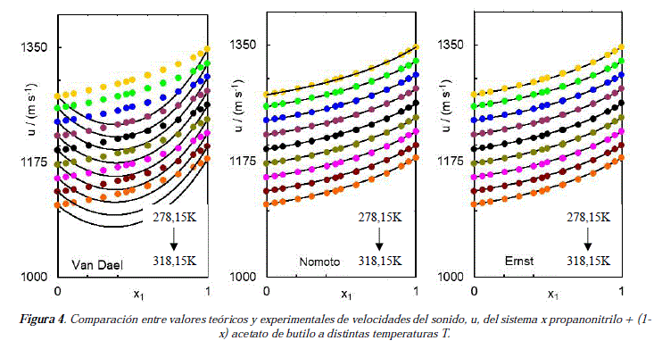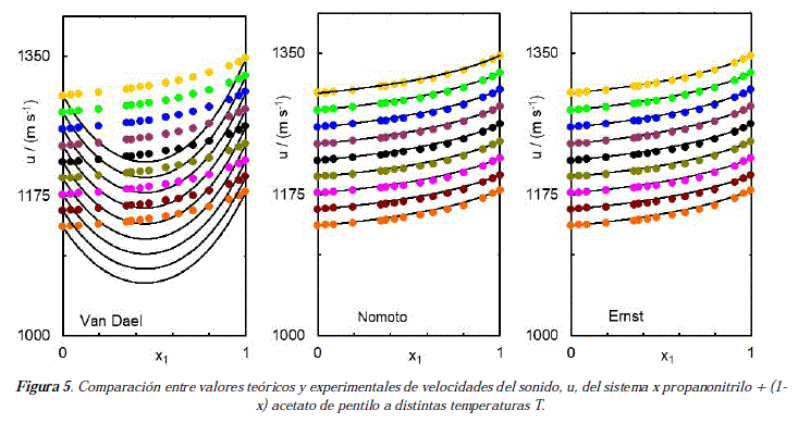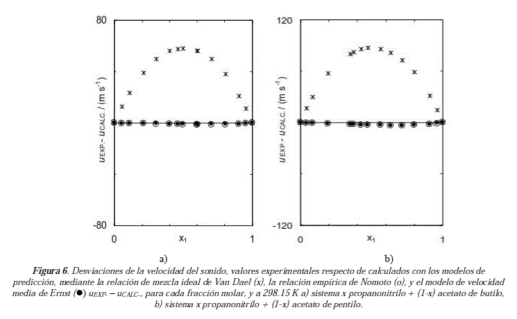 La predicción de las velocidades del sonido del sistema produjo buenos resultados con dos de los tres modelos aplicados, y para todas las temperaturas estudiadas, como se muestra en las figuras 4 y 5. Las predicciones obtenidas con los modelos de Nomoto y de Ernst concuerdan mejor con los valores experimentales de la velocidad que la relación de Van Dael para las mezclas propanonitrilo + acetato de butilo y para el sistema propano nitrilo + acetato de pentilo.