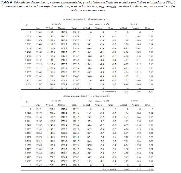 Las velocidades ultrasónicas calculadas, junto con las velocidades experimentales, el porcentaje de error en las predicciones respecto de los valores experimentales y las desviaciones de los valores experimentales respecto de los teóricos, uEXP. - uCALC, para cada fracción molar, y a 298,15 K, de los dos sistemas estudiados, se muestran en las Tabla 6.