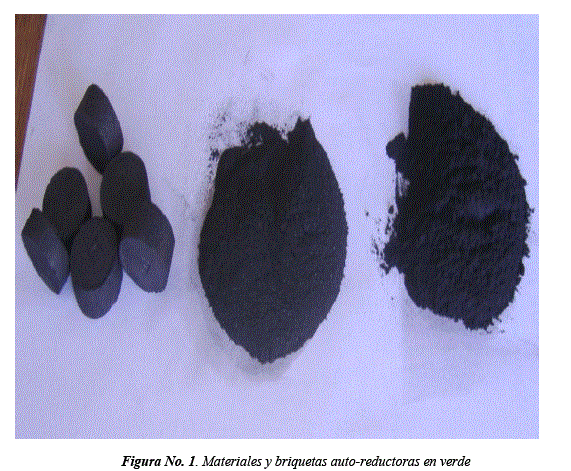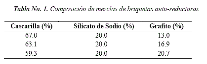 Se formaron briquetas usando un formador metálico con un diámetro interno de aproximadamente 25.4mm. Se prepararon diferentes mezclas constituidas por cascarilla de laminación, grafito y silicato de sodio. La Tabla No. 1, presenta las composiciones de mezclas utilizadas para las diferentes muestras. A fin de obtener buena plasticidad de las mezclas y facilitar la formación de las briquetas se añadió agua en una cantidad determinada. Las briquetas así conformadas y en verde, se llevaron a secado a temperatura ambiente durante tres días. La Figura No.1, muestra los materiales y las briquetas en verde.