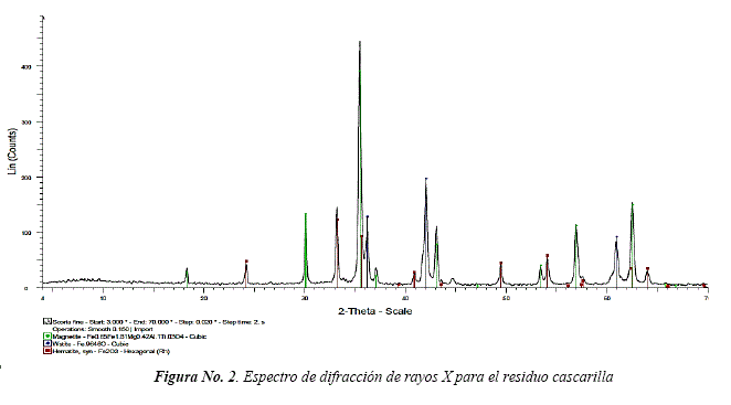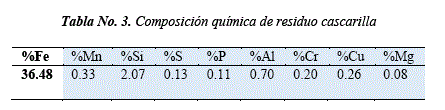 La Tabla No. 3, muestra la composición elemental porcentual del residuo cascarilla donde se puede apreciar que el mayor contenido corresponde al elemento Fe. La presencia de elementos como Cu, Mg y Al corresponden a elementos contaminantes externos.