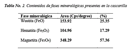 La Tabla No. 2, presenta los contenidos porcentuales de las fases mineralógicas calculadas a partir de las áreas debajo de los espectros. Se destaca la presencia de magnetita (Fe3O4) como óxido en mayor proporción (57.36%). Gaballah et. al, [13], reporta la presencia de los mismos óxidos de hierro además de cuarzo y hierro metálico para una cascarilla de laminación procedente de plantas egipcias.