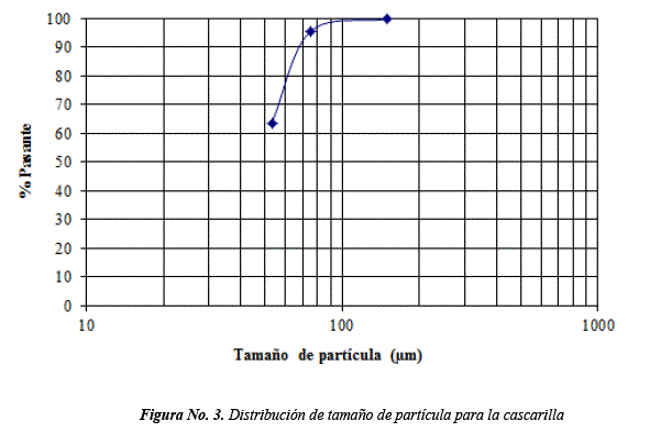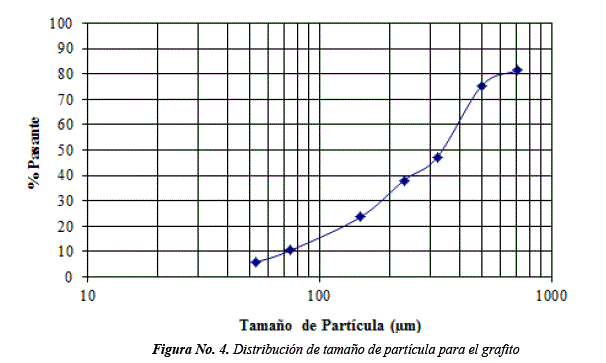 Las Figuras No. 3 y 4, muestran las gráficas de distribución de tamaño de partícula correspondientes a la cascarilla y al grafito.