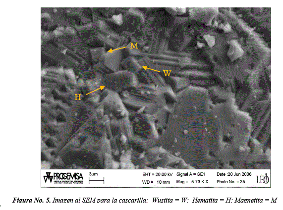La Figura No. 5, presenta formaciones cristalinas con hábito cristalino cúbico-hexaoctaedral correspondiente a la Wustita (FeO), trigonal-hexagonal de Hematita e isométrico-hexoctahedral que corresponde a la magnetita, en muestra de cascarilla [15].
