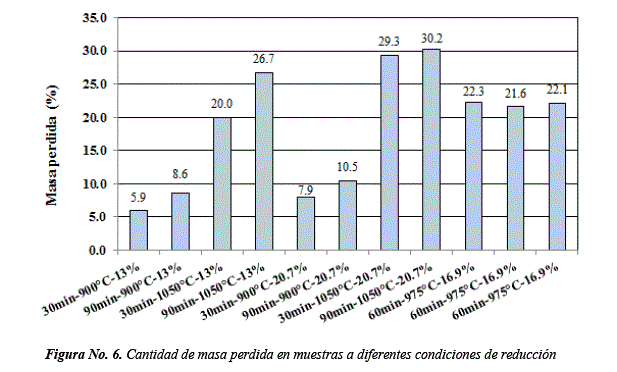 En la Figura No. 6, se presenta cantidad de masa perdida (ΔM), para muestras reducidas a diferentes condiciones de prueba.