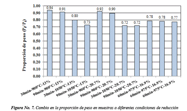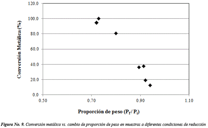 A menor proporción de disminución de peso (Pf/Pi), la conversión metálica aumenta. Así, cuando Pf/Pi es igual a 0.73 se alcanza 99.9% de conversión metálica, mientras que para 0.72 corresponde 95.0 y 94.4%. Un indicio físico del grado de conversión de óxido a hierro metálico, está dado por ΔM y Pf/Pi que reflejan la pérdida de masa causada por la gasificación del carbono y la remoción del oxígeno contenido en el óxido durante el proceso de reducción