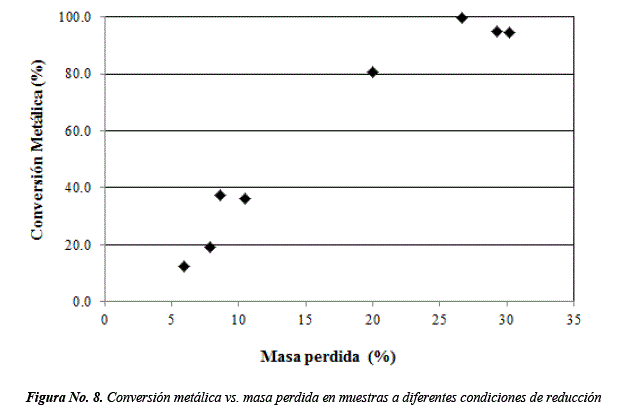 Con respecto a la pérdida real de masa (ΔM), para un 26.7% de masa perdida, corresponde un grado de conversión metálica igual a 99.9%, mientras que para 29.3 y 30.2 son de 95.0 y 94.4% respectivamente. Los valores de pérdida real de masa obtenidos son cercanos a aquellos reportados para el caso de un proceso de auto-reducción completa [9].
