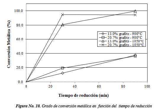 La Figura No. 10, muestra el efecto del tiempo de reducción sobre el grado de conversión metálica para pruebas a 900 y 1050°C con cantidades de grafito de 13.0 y 20.7%.