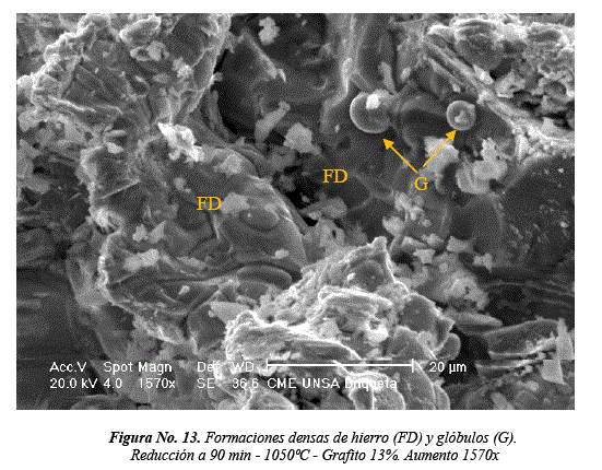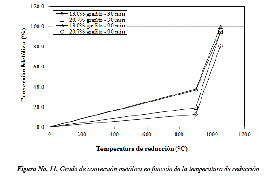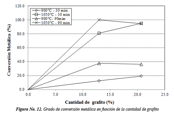 A 1050°C, el grado de conversión metálica se incrementa de 99.9 a 94.4%. De 900 a 1050°C, el grado de conversión aumenta 2.66 veces cuando se adiciona 13% de grafito y 2.5 veces con 20.7% de grafito en la mezcla. A altas temperaturas existe una concentración de gases reductores que promueve el equilibrio según la reacción de Boudouard, formando alta densidad de núcleos de hierro por una buena difusión [9]. Se puede afirmar que a esta temperatura y con 90 min. de reducción, el material reductor alcanza la gasificación completa no teniendo influencia en el proceso.