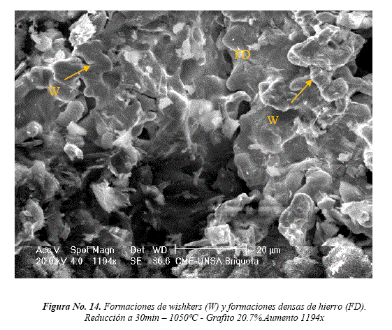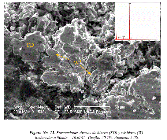 Las formaciones densas y compactas de hierro se presentan a 1050°C, 90 min. y 13% de grafito. Se establece una secuencia en la morfología de hierro metalizado en función de la temperatura: A 900°C, se inicia la metalización mediante la formación de filamentos y agregados sintetizados de hierro, continuando progresivamente hasta 1050°C con formaciones de whiskers y capas densas compactas con ausencia de porosidad [23]. La formación de whiskers y glóbulos de hierro [10] ocasiona hinchamiento y un aumento del volumen en las briquetas auto-reductoras. Coincidentemente, Al-Kelesh, H., [24] identifica granos pequeños esféricos que crecen para formar clusters sintetizados. Al formarse capas metalizadas densas y compactas, hay una contracción con la consiguiente reducción de su volumen.
