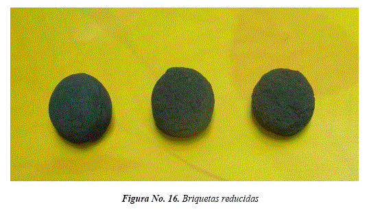 La Figura No. 16, muestra las briquetas auto-reductoras después del proceso de reducción carbonotérmica a 1050°C por 90 miny con una cantidad de grafito de 13.0%.