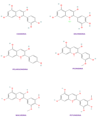 Las antocianinas (a veces se usa indistintamente el término antocianina para las antocianidinas [aglicona o genina] así como para sus glucósidos [antocianinas]) son compuestos polifenólicos naturales que aportan pigmentación a una diversidad de frutos y flores, incluso verduras (Figura 1). Se han descrito 12 antocianidinas, las más importantes, cianidina, delfinidina, pelargonidina, peonidina, malvidina y petunidina 1. Las antocianidinas previamente mencionadas son las responsables de aportar los distintos tonos de pigmentación que van desde el rojo, al azul y al violeta.