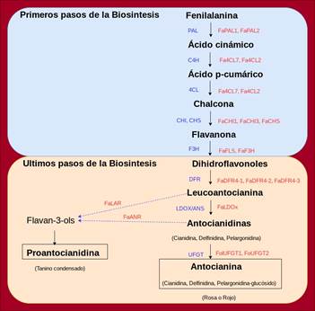 Las antocianinas consisten en pigmentos solubles en agua que por lo general son los principales responsables de aportar una variedad de colores a las plantas, distinguiéndose el rojo, azul y morado. La cianidina, delfinidina, pelargonidina, peonidina, malvidina y petunidina son las antocianidinas más comunes distribuidas en las plantas, siendo sus distribuciones relativas por lo general, aproximadamente del 50%, 12%, 12%, 12%, 7% y 7%, respectivamente. Cada una de estas antocianidinas se manifiestan fenotípicamente en la planta o fruto de un color característico. Por ejemplo, la pelargonidina aporta un color rojo vivo en bayas, la delfinidina brinda un color azul oscuro en varias petunias, y la cianidina confiere un color magenta o purpura a las flores y un color rojo para algunas frutas 21. Las pelargonidinas y cianidinas son las principales antocianidinas que se pueden encontrar en frutos con colores rojo-brillantes y oscuros 2. Las antocianinas se sintetizan a través de la vía de los flavonoides a partir de dos tipos de genes: estructurales y reguladores 16. Los genes estructurales juegan un rol indispensable en la biosíntesis de flavonoides y antocianinas e influyen en los mecanismos de función de la fenilalanina amoniacalasa (PAL), chalcona sintasa (CHS), chalcona isomerasa (CHI), flavanona 3-hidroxilasa (F3H), flavonoide 3’-hidroxilasa (F3’H), dihidroflavonol 4-reductasa (DFR), antocianidina sintasa (ANS), UDP glucosa: flavonoide-3-O-glucosil transferasa (UFGT) y glutatión S-transferasa (GST) 9.