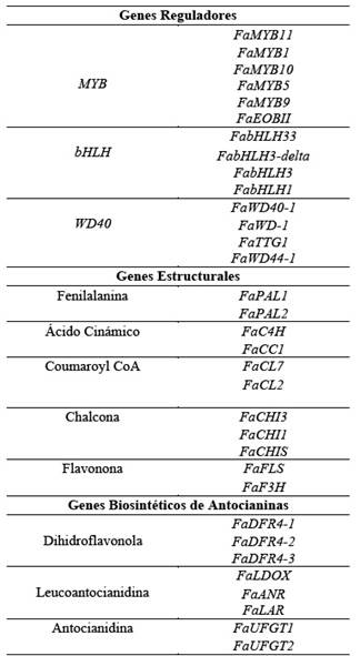 Las proteínas reguladoras tienen control sobre la biosíntesis de antocianinas y regulan la expresión de genes estructurales a niveles transcripcional y postranscripcional 18. Estas proteínas reguladoras se modulan diferencialmente por el azúcar y hormonas. Estudios previos en esta área sugieren que los azúcares sirven como señales esenciales para modular la biosíntesis de antocianinas. Un ejemplo es la sacarosa, la cual es la principal fuente de carbono para la síntesis de antocianinas y determina el sabor y calidad del fruto 22. Por otra parte, las hormonas vegetales como auxinas, giberelinas, citoquininas, ácido abscísico, ácido jasmonato y etileno, también juegan roles de alta importancia en la regulación de la biosíntesis de antocianinas. Éstas pueden estar asociadas a regular la madurez de frutos no climatéricos con respecto al ablandamiento de frutos y acumulación de antocianinas 8. Los factores de transcripción (TF´s) son reguladores esenciales para la expresión de genes estructurales en la biosíntesis de antocianinas, como: MYB, bHLH, WRKY, y ERF. Los factores de transcripción MYB asociados a la expresión de genes como MYB39, MYB86, MYBIR, MYB10 y MYB1, regulan la coloración fenotípica de varios frutos. Ésto puede indicar que los TF’s reprimen o potencian la acumulación de antocianinas 18. Además, los genes bHLH pueden interactuar con los genes MYB para regular la biosíntesis de proantocianidinas. Con base en investigaciones anteriores, son varios genes bHLH los que responden en el proceso de biosíntesis de antocianinas en la fruta, como lo revelan los perfiles de expresión y análisis de redes (Tabla 1) 8.