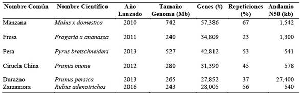 Con el desarrollo de nuevas tecnologías de secuenciación de próxima generación se ha logrado la reducción de costos para la secuenciación de genomas. En consecuencia, también ha facilitado la finalización, hasta la fecha, de más de 150 genomas en plantas 10. Por ejemplo, con las tecnologías de secuenciación Illumina, ha sido posible determinar características más específicas de los genomas Fragaria x ananassa y Rubus adenotrichos. Por otro lado, la disposición de plataformas bioinformáticas aporta la oportunidad de registrar y almacenar datos de alta importancia para su consulta (Tabla 2). El genoma de Fragaria x ananassa es del tamaño de 240 Mb, constituido por aproximadamente 34,809 genes. Mientras que el genoma de Rubus adenotrichos es del tamaño de 243 Mb, constituido por aproximadamente 28,005 genes 21.