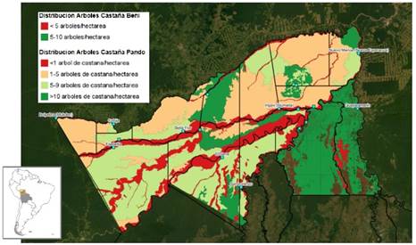 Los mayores productores de castaña en Bolivia se localizan principalmente en los departamentos de Beni y Pando (Figura 2), con una densidad de árboles de castaña por hectárea de 5 a 10 árboles en Beni y de 1 a 9 árboles en Pando8.