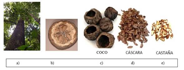 La castaña es un árbol nativo de la Amazonía de la especie Bertholletia excelsa, Bonpl. de la familia Lecythidaceae9. El fruto del árbol de castaña es una cápsula esférica maderosa grande denominada coco de castaña, dentro del cual se pueden encontrar de 12 a 24 nueces o semillas. La semilla de castaña consiste de una cáscara externa dura y delgada, y un grano blanco (parte comestible de las semilla) (10.