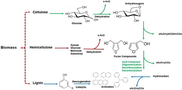 En el proceso de licuefacción hidrotermal de biomasa, la celulosa y la hemicelulosa reaccionan con agua a una elevada temperatura. Los enlaces de hidrógeno se rompen y se forman moléculas de glucosa, fructuosa y otras unidades monoméricas. Posteriormente, estos compuestos se degradan a hidrocarburos simples. De manera general, la celulosa y la hemicelulosa se degradan hasta formar ácidos, ésteres alquilo de ácidos grasos, cetonas, aldehídos, furanos, alcoholes y éter, mientras que la lignina se degrada para formar compuestos aromáticos 35.
