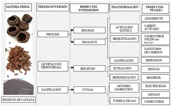 La conversión de los residuos de castaña mediante estas tres tecnologías produce diferentes productos de interés. Mediante la licuefacción hidrotermal se obtiene principalmente una fracción líquida entre un 20 a 50% para la obtención de biocombustibles como el biodiesel. Según las condiciones de operación, los productos de interés en el proceso de pirólisis son el bioaceite y el biochar. Mientras que, en la tecnología de gasificación, se obtiene principalmente un producto gaseoso con propiedades para la generación de energía eléctrica.