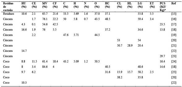 Tabla 1 Composición química y análisis proximal de los residuos de castaña. Los valores reportados son HU: Humedad, CE: Cenizas, MV: Material Volátil, CF: Carbón Fijo, C: Carbono, H: Hidrógeno, N: Nitrógeno, O: Oxígeno, HC: Holocelulosa, HL: Hemicelulosa, CL: Celulosa, LG: Lignina, ET: Extractivos, PCS: Poder Calorífico Superior. Elaboración propia en base a referencias.