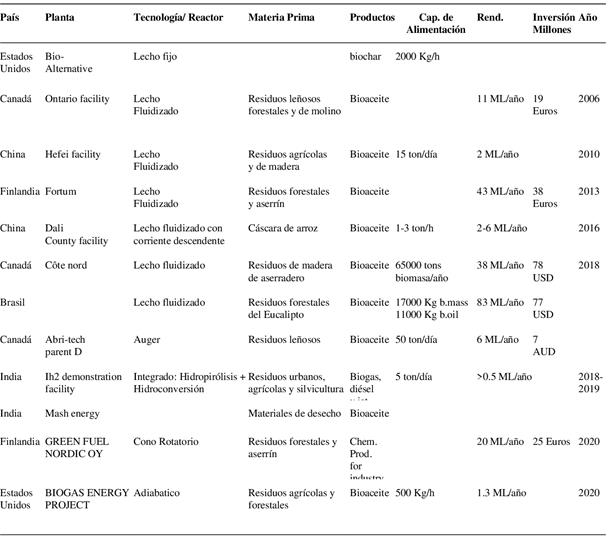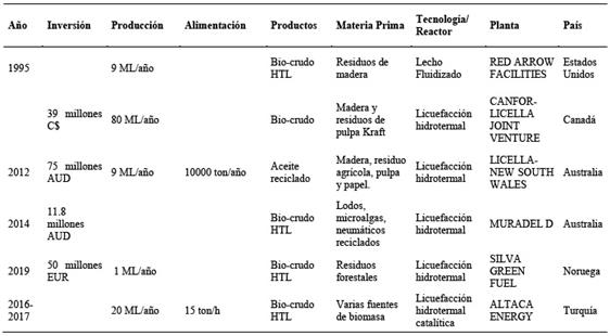 La Tabla 17 muestra algunas de las plantas comerciales que han optado por la licuefacción hidrotermal como proceso de conversión de biomasa a nivel global.