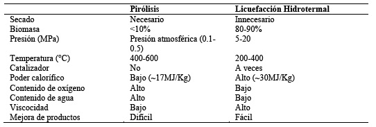 Tabla 11 Comparación de los procesos de licuefacción hidrotermal y pirólisis para la conversión de biomasa en biocrudo y bioaceite, respectivamente. Elaboración propia en base a referencias [64,65]