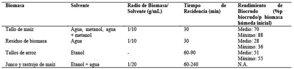 En la Tabla 12. se muestran los tipos de biomasa agrícolas, el solvente utilizado, el ratio de biomasa a solvente, el tiempo de residencia y los rendimientos de conversión de biomasa en biocrudo en un proceso HTL. Estos valores pueden variar dependiendo de la materia prima utilizada, los parámetros de operación, catalizadores utilizados y solventes 64.