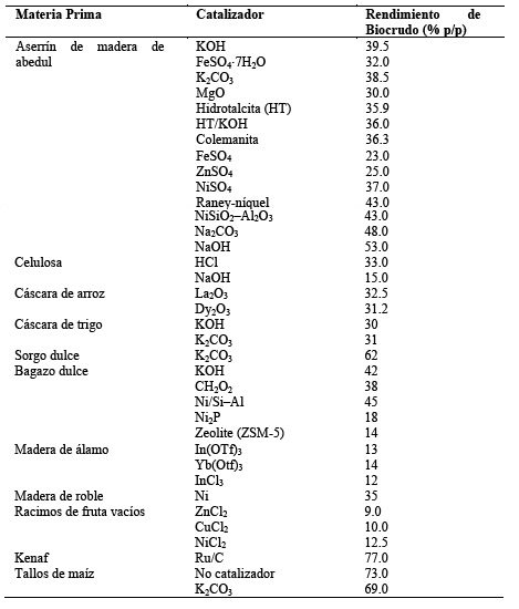 Tabla 13 Efecto de diferentes catalizadores en el rendimiento de biocrudo HTL.Elaboración en base a referencias [37,66]
