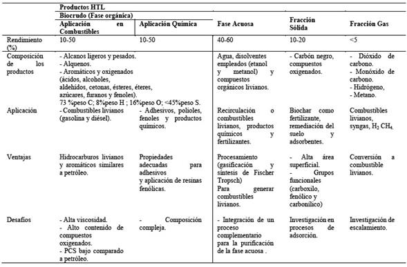 Tabla 14 Rendimiento, composición, aplicación, ventajas y desafíos de las fracciones producto del proceso HTL. Elaboración propia en base a referencias [37,63,67]